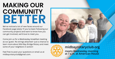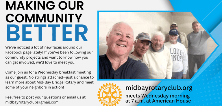 Visit us at the Mid Bay Rotary Club in Niceville, Florida, where we serve the community and foster fellowship. We meet at the beautiful American House near Bluewater Bay on the 5th floor.